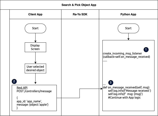 Let’s imagine an application where you show a screen asking from the user to choose which object the robot should pick. Once the user makes a choice, you need to send that data to the Python app, that is in charge of looking for that object, sending the robot to the position of that object and picking it. Of course that you can create a local server and handle the entire communication. But it can be much faster and easy with this controller.