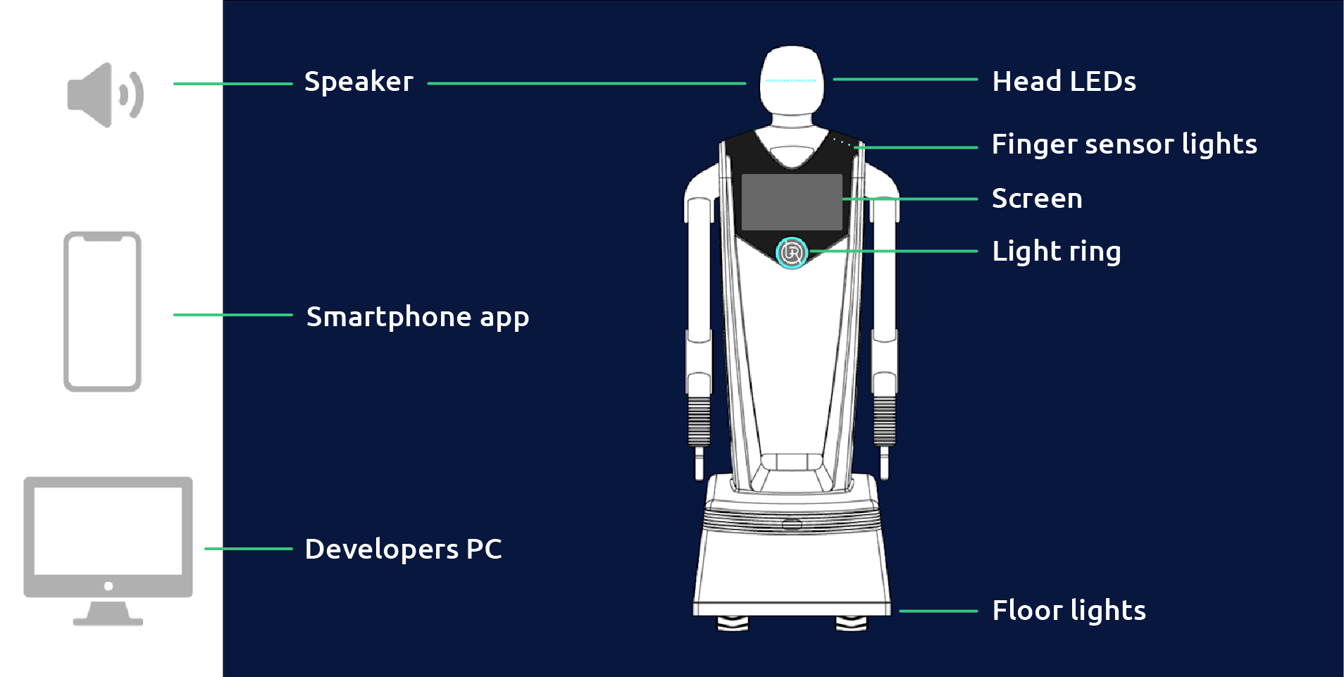 Interactions are a simplified and easy-to-use way to interact with end-users, when trying to express a message like letting the user know that the robot is waiting for some input, that it’s processing info or that the battery level is low.