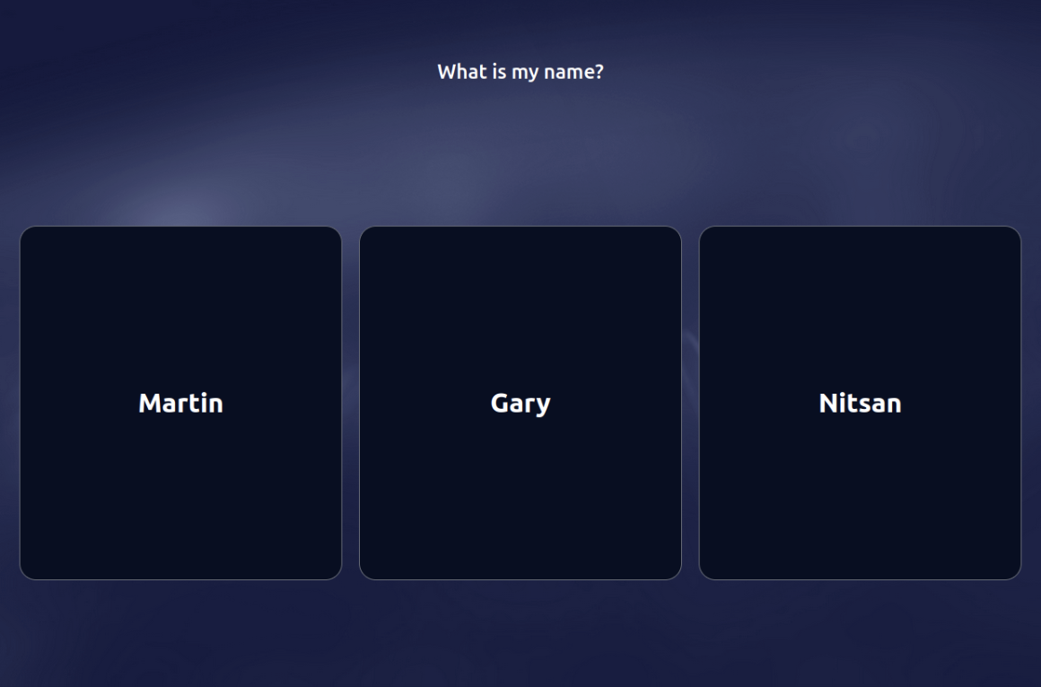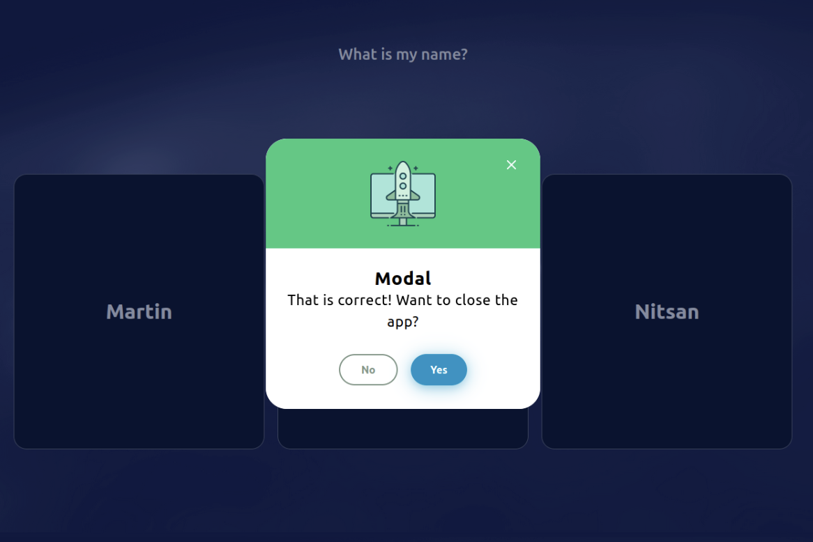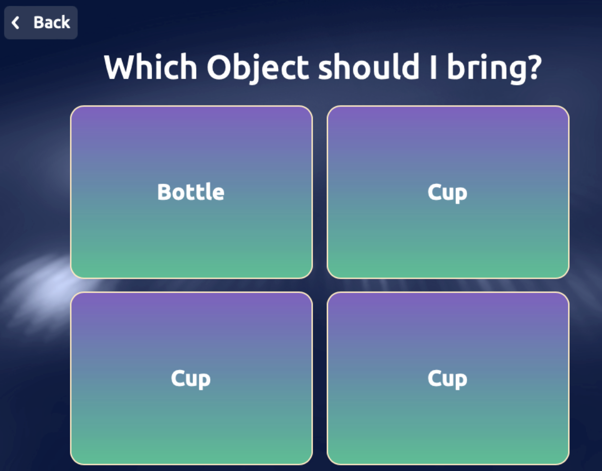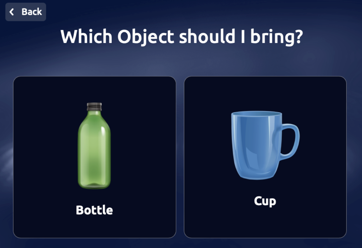 The choice selector component provides a selection screen and is used when the user needs to select an item among several options. The component can be used for example to select which object to pick or choose the desired room for the robot to navigate to.