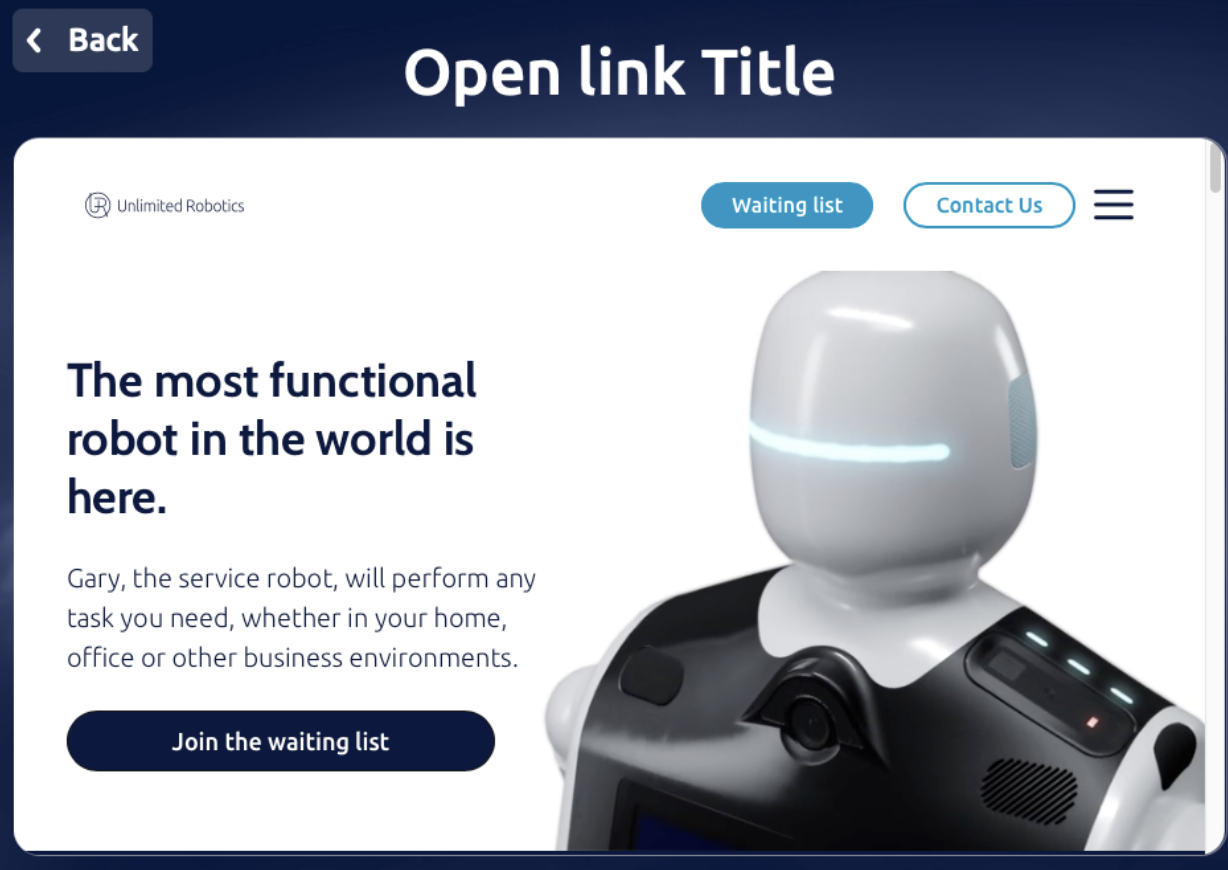 The open link component provides a window of an internet url(appears as it would on a search engine) by taking it as an argument. It provides a title to display information about the url. Users are able to interact with the url and view animations as they would be able to on a browser.